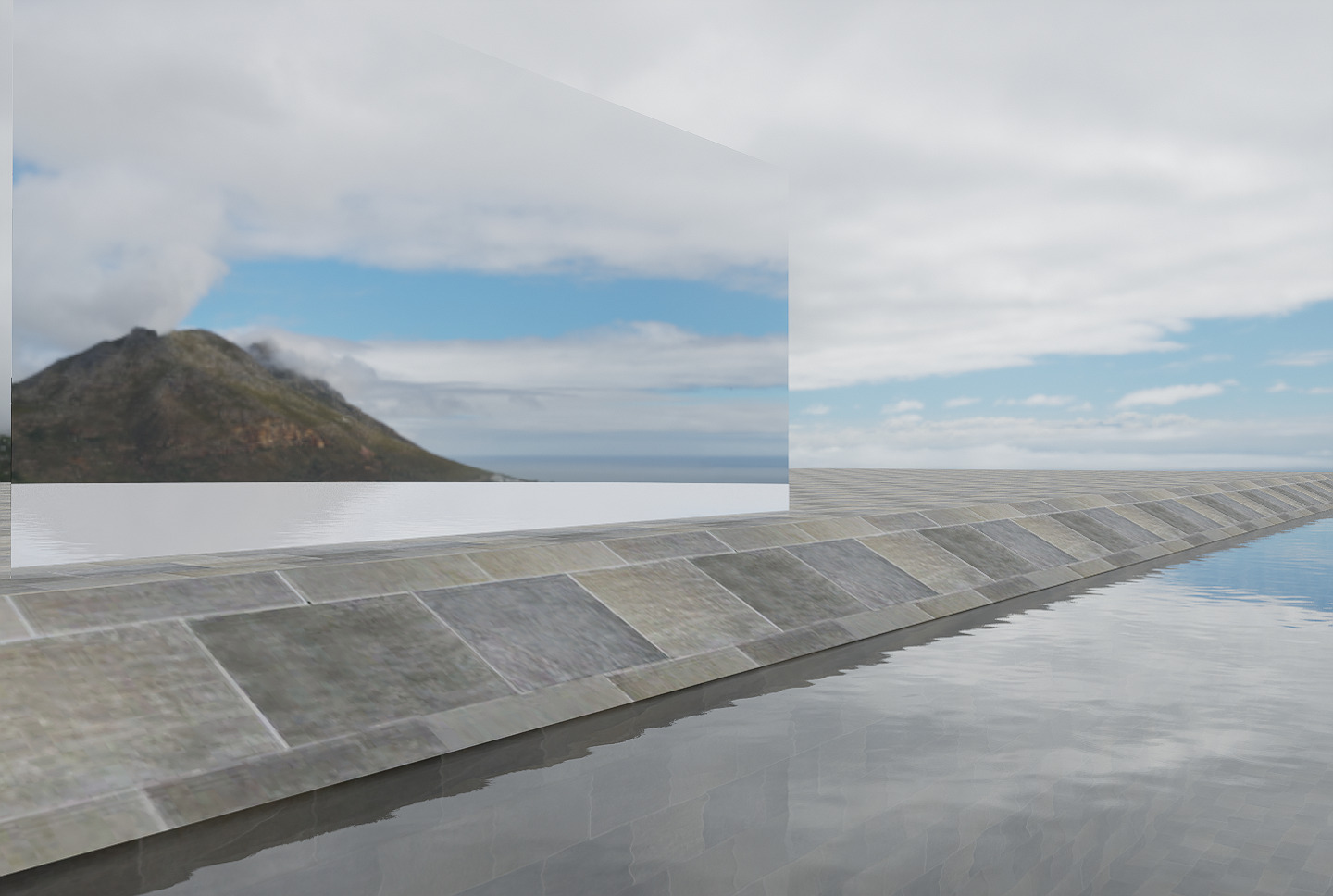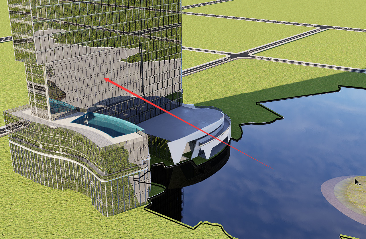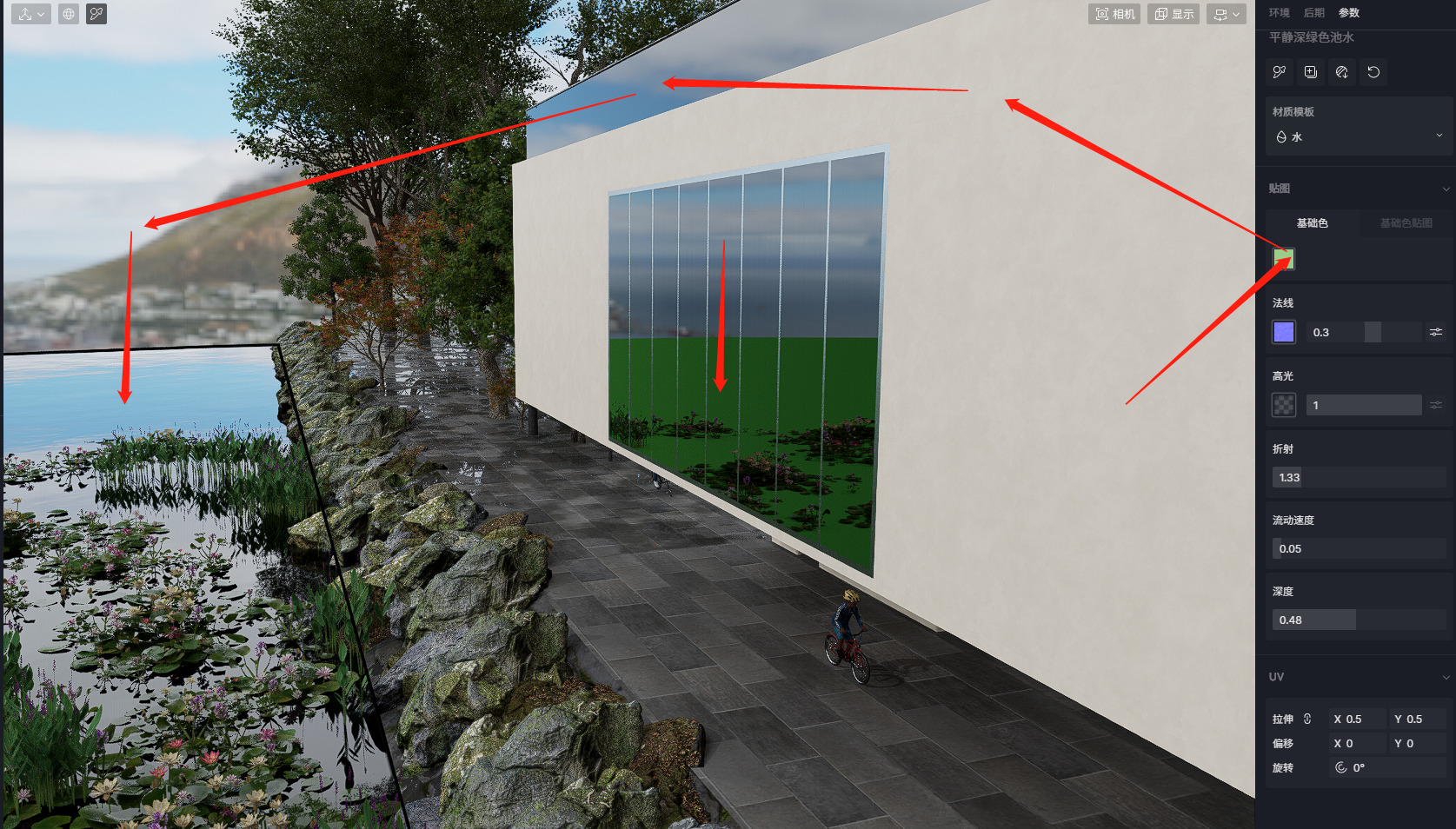 如下图所示,玻璃幕墙反射出的水面是没有材质的(裸模),这个希望能解决一下