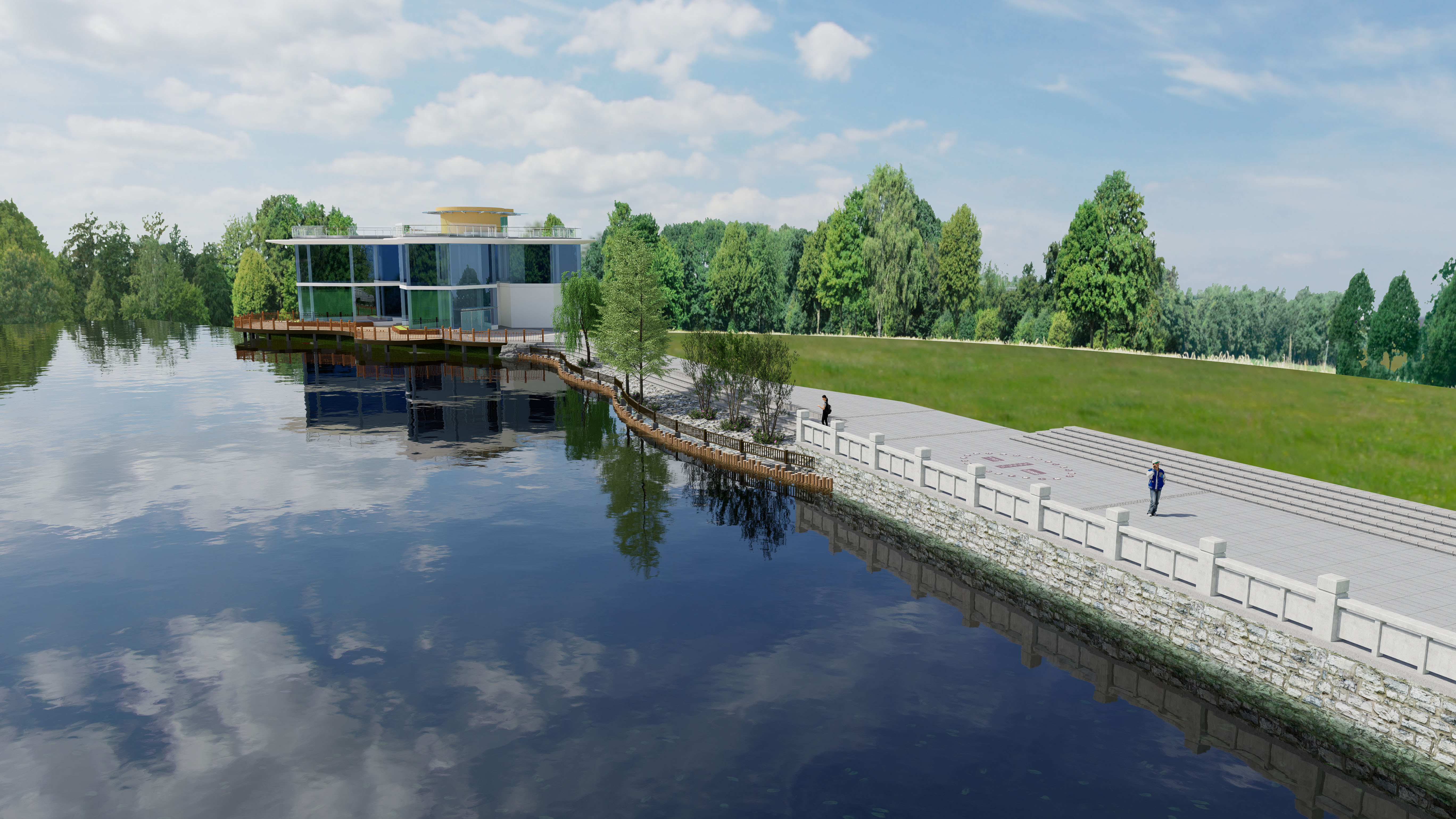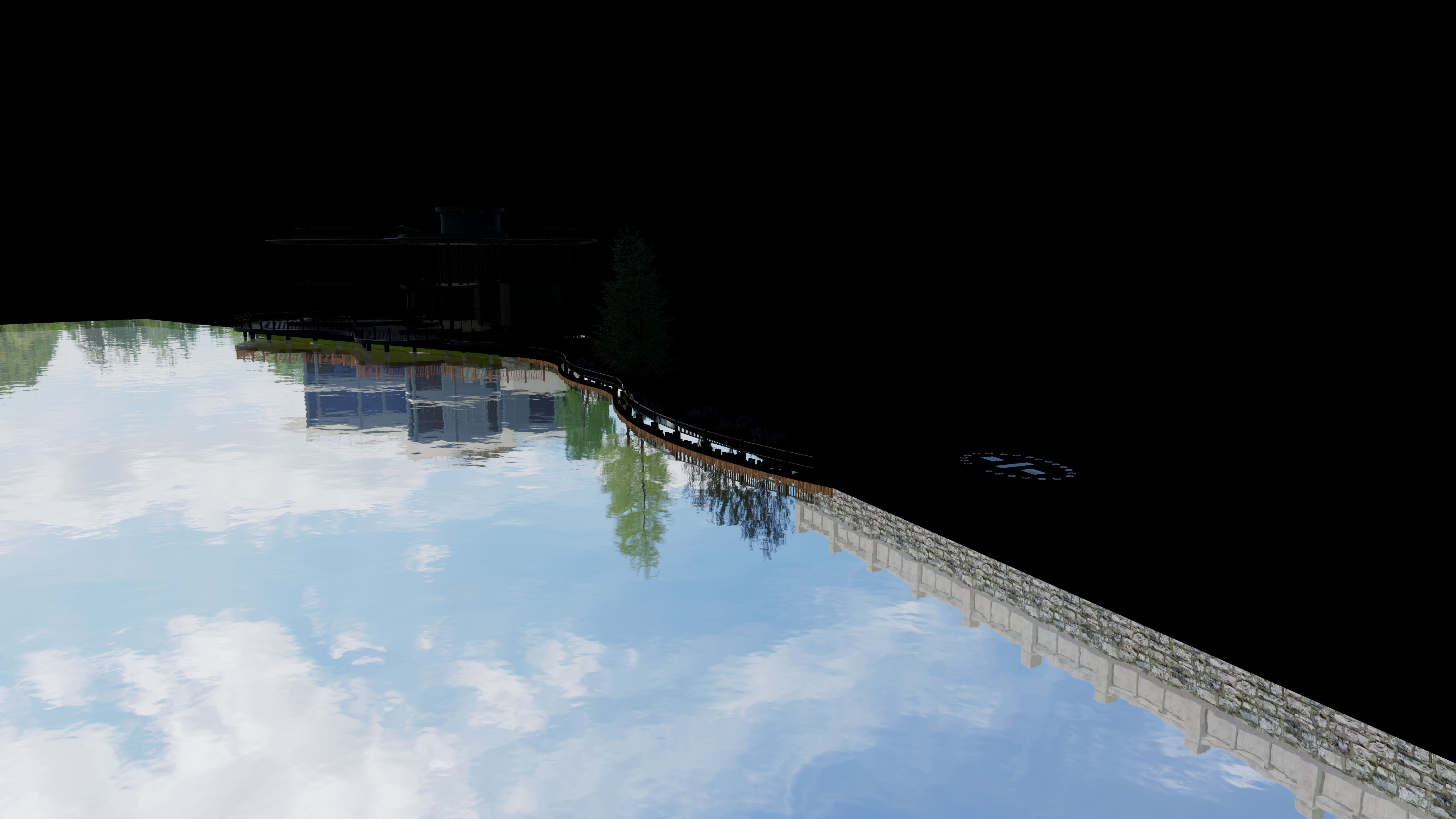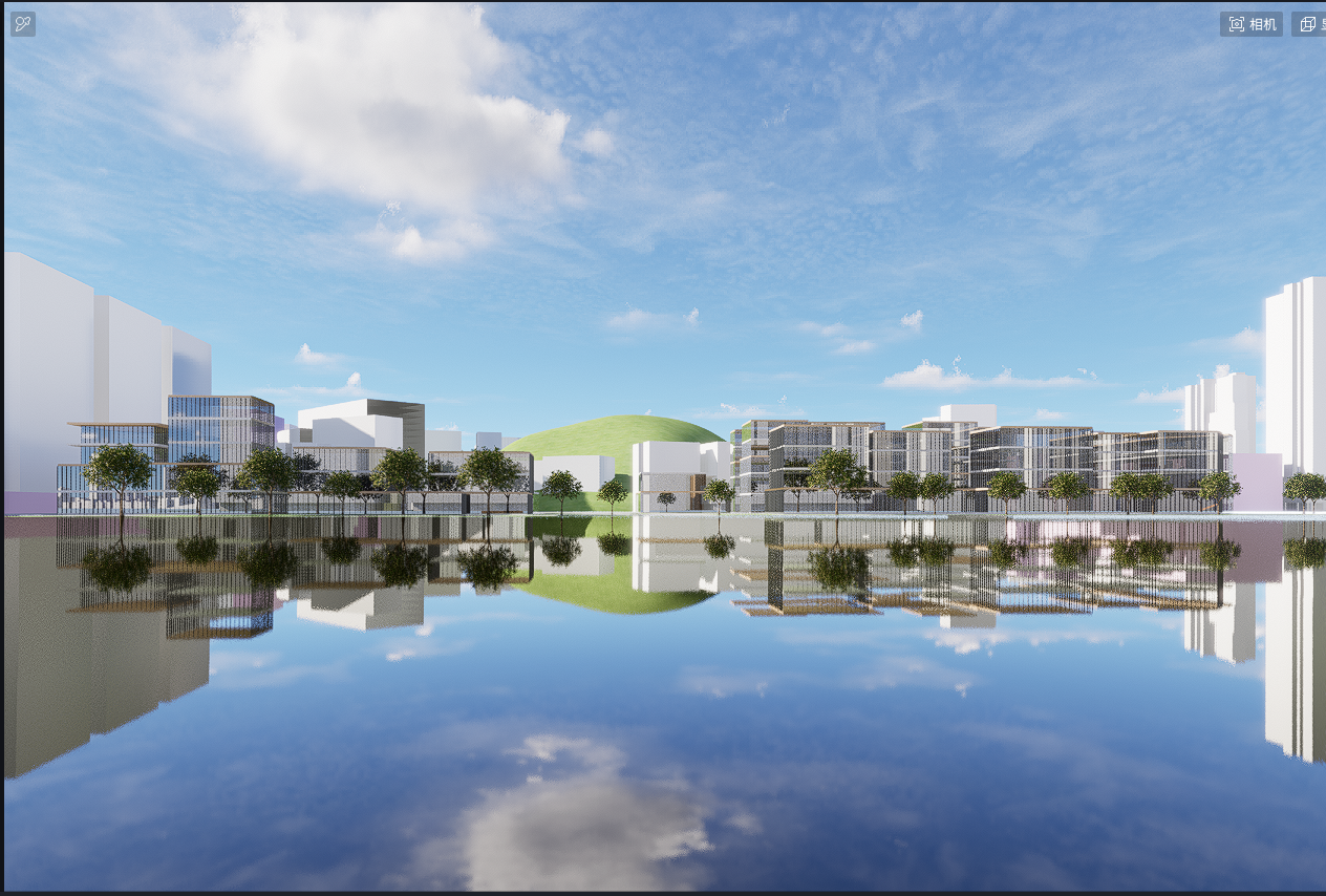 渲染以后,建筑玻璃在水中有投影了,但水中投影的玻璃上没有反射。