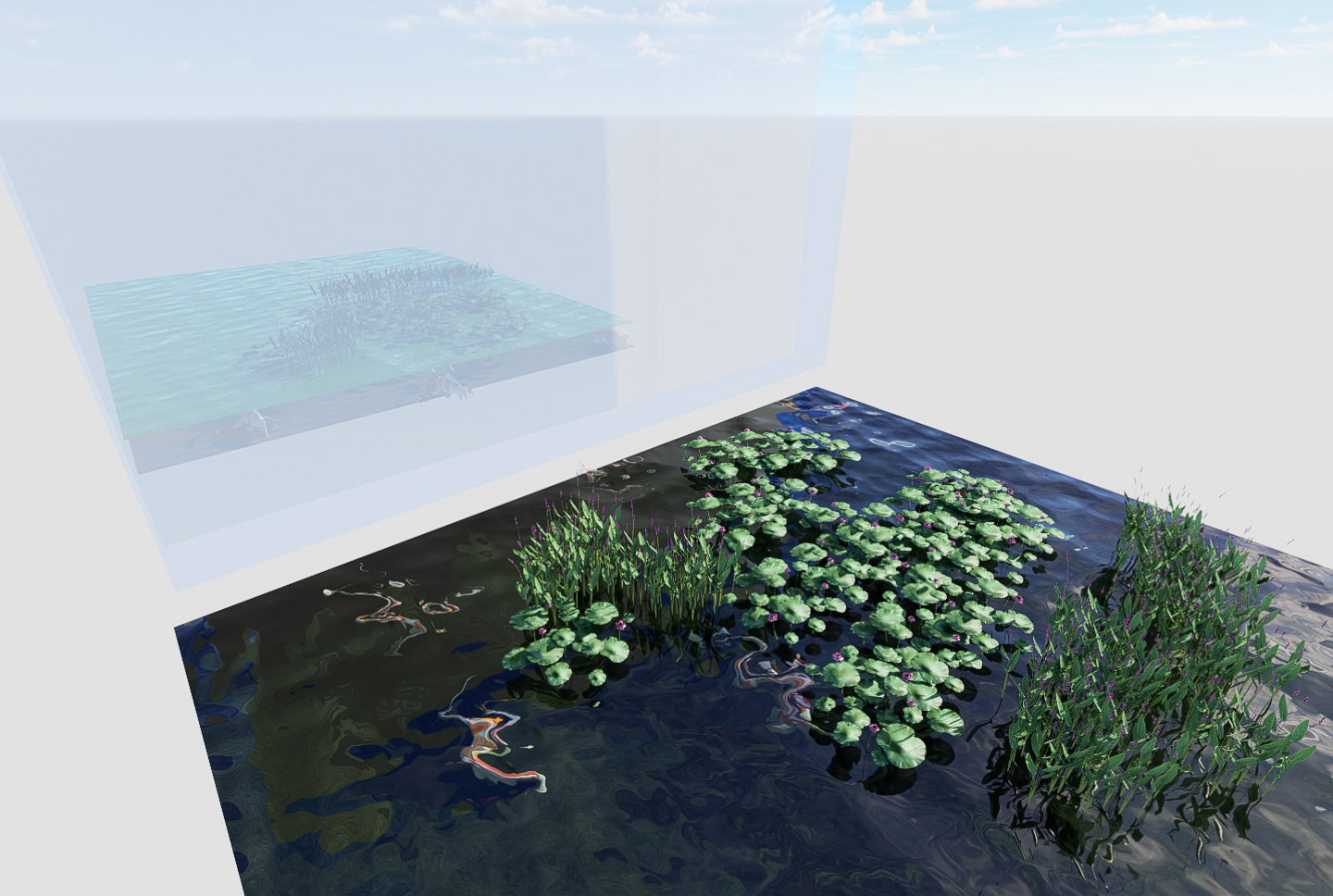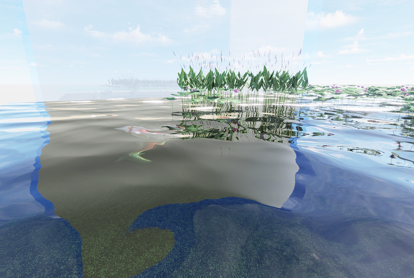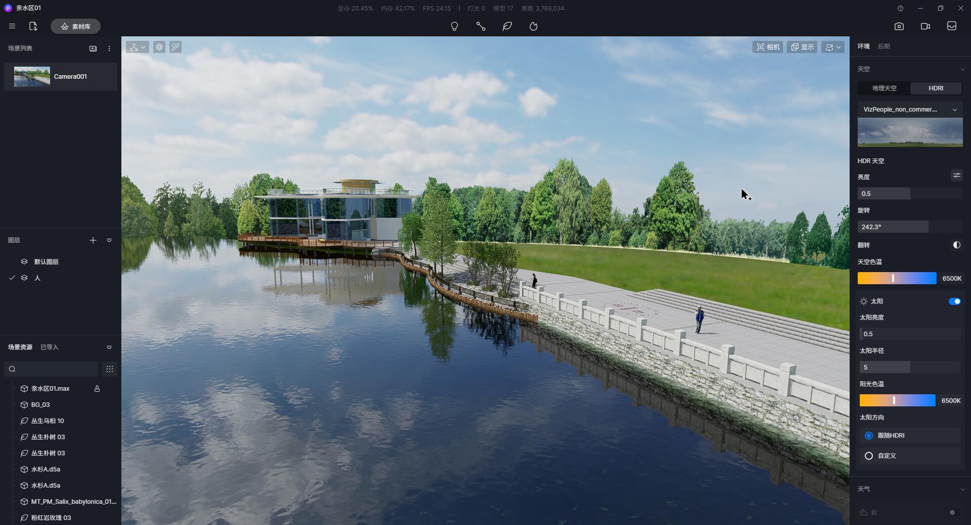 在操作界面实时渲染当中,建筑玻璃在水中没有投影。