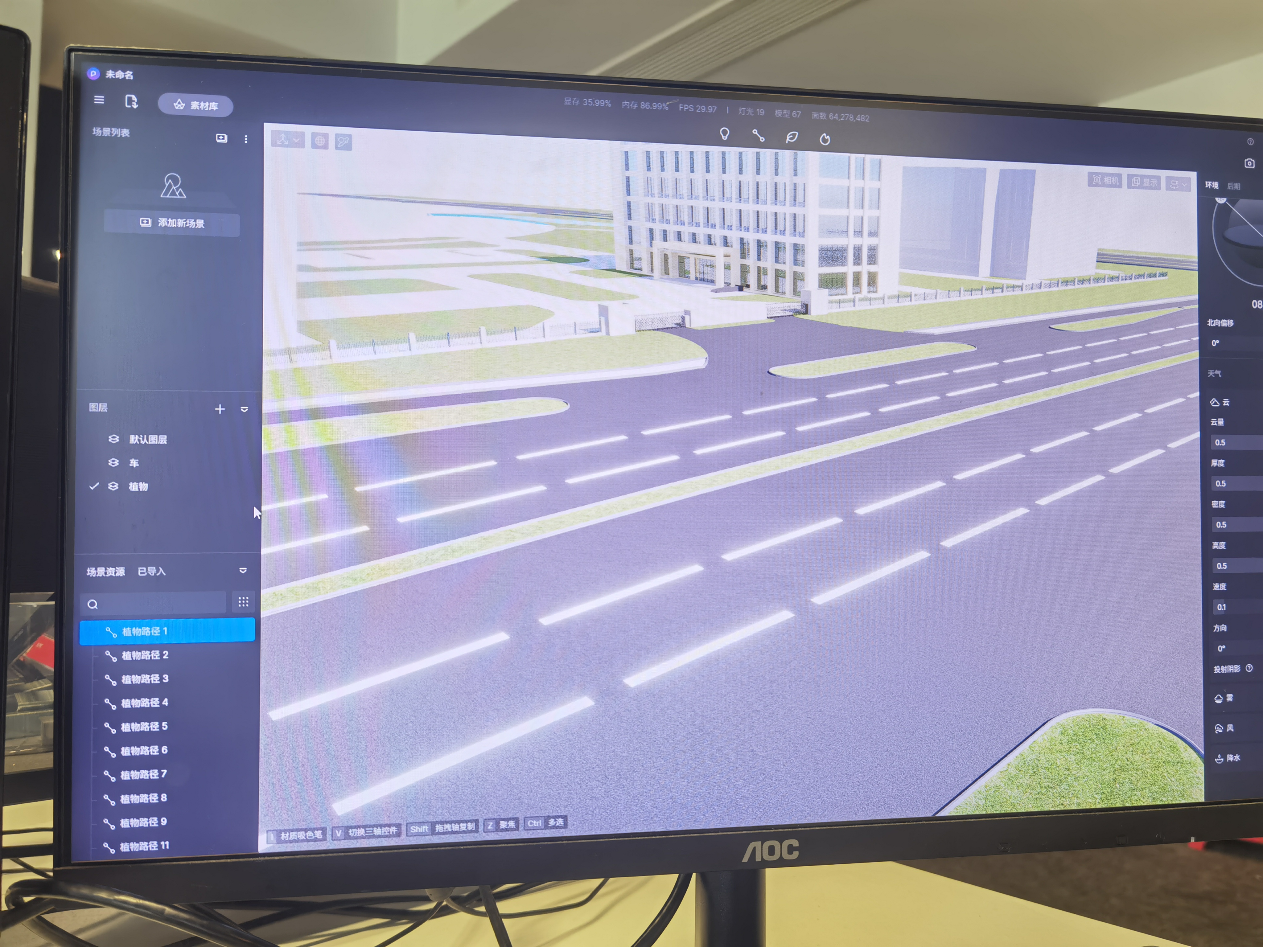 在D5 中,建筑和道路 分成两个文件 导入, 你把建筑先用层隐藏起来, 把道路和植物 显示出来,看植物是否 在D5 中显示的出来,如果显示正常,在渲染测试 一下 看植物能否渲染出来。 主要思路 减少 D5 加载资源。