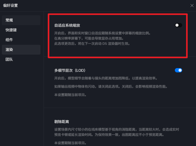您同一个屏幕设备下2.5可以正常显示吗,还是只有2.6模糊。输出渲染图片在此设备上显示会模糊吗?您的自适应系统缩放开启后有进行重启D5吗?