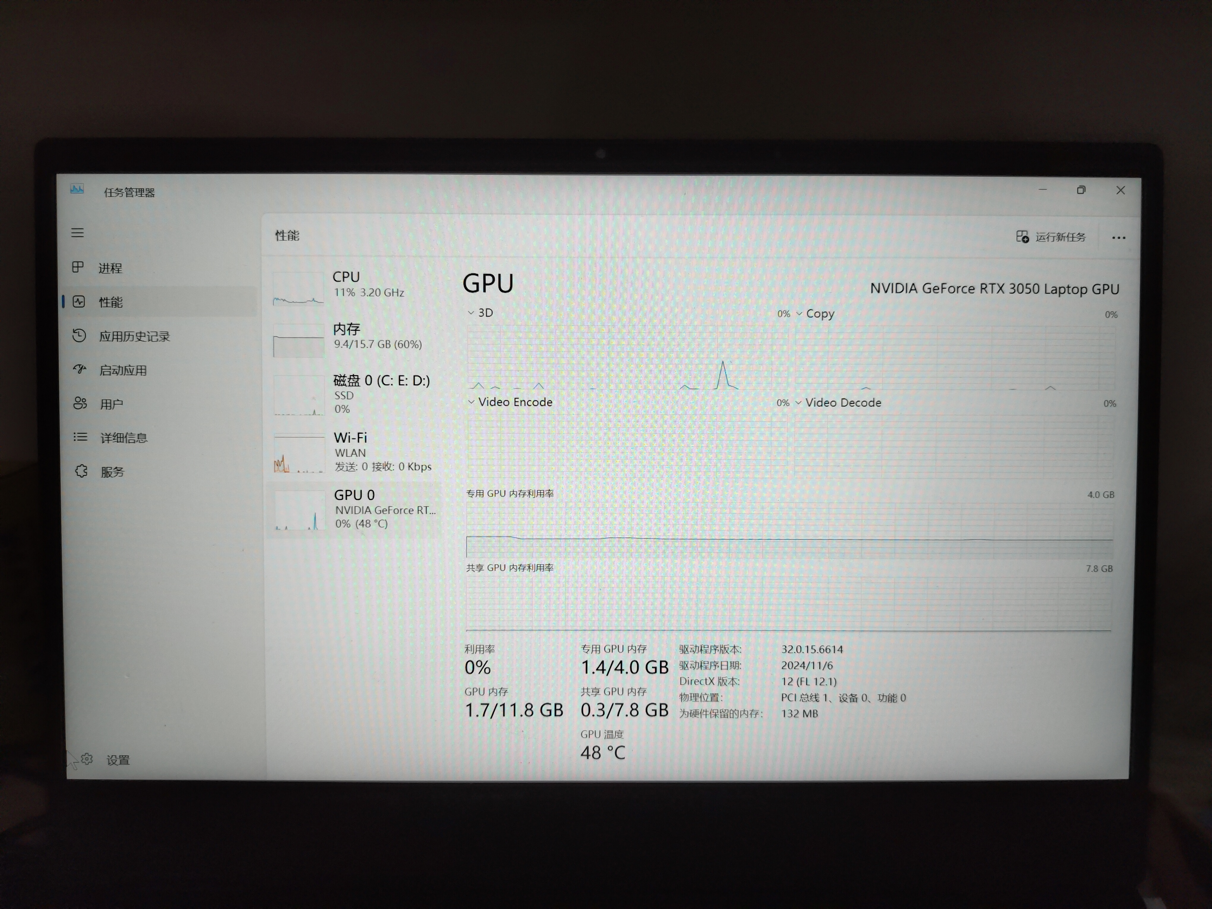 显卡及显卡驱动版本 NVIDIA GeForce RTX 3050 Laptop GPU 32.0.15.6614