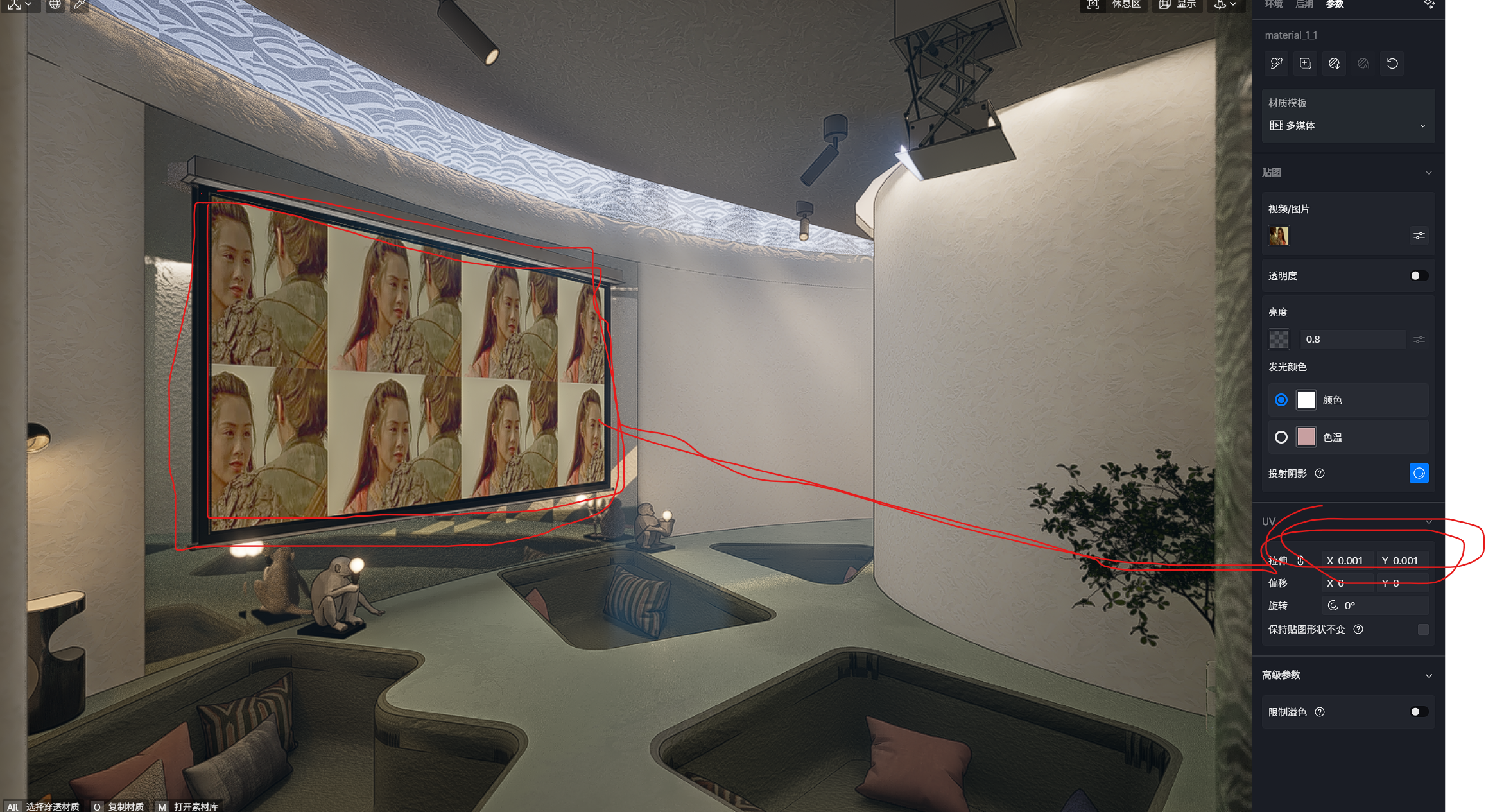 感谢反馈,我们排查一下投影幕布该模型的uv问题导致的贴图过小问题。如果您是静态图像,可暂时先将多媒体材质切换为自定义材质模板,开启材质参数下的三项映射修复后可对uv进行调整。