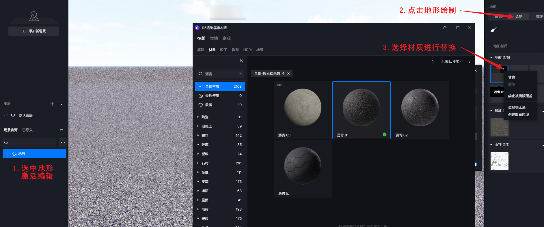 你好,请问我怎么才能改变D5背景那个无限大的地面的材质?我嫩想到的就是建一个特别大的面然后赋材质,但是某些人视的角度还是会看到这个面的边缘以外的背景地面。比如我现在这文件不知道为什么地面就是草地,我只是想让它变成混凝土的地面