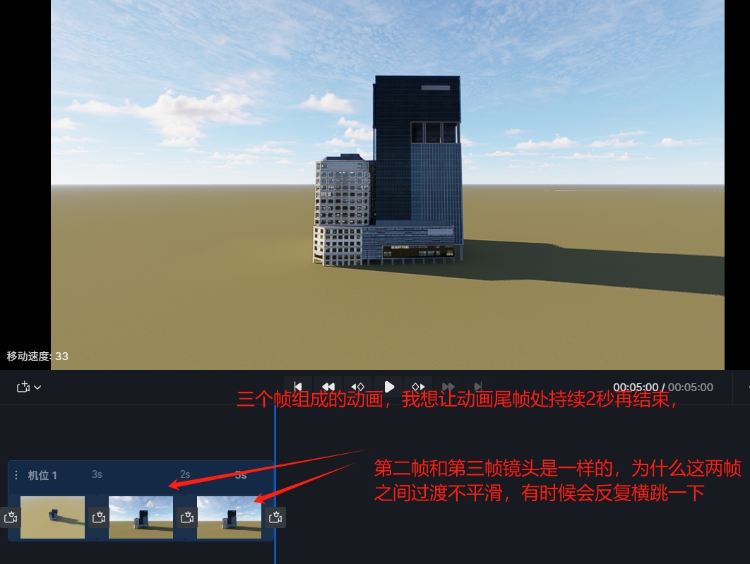 您好,动画片段之间过渡出现不平滑情况,您可尝试选中整个机位,在右侧编辑路径中查看路径节点之间是否平滑。或在选中最后需要停留2s的这一帧基础上再点击添加片段,查看是否还会出现此问题。