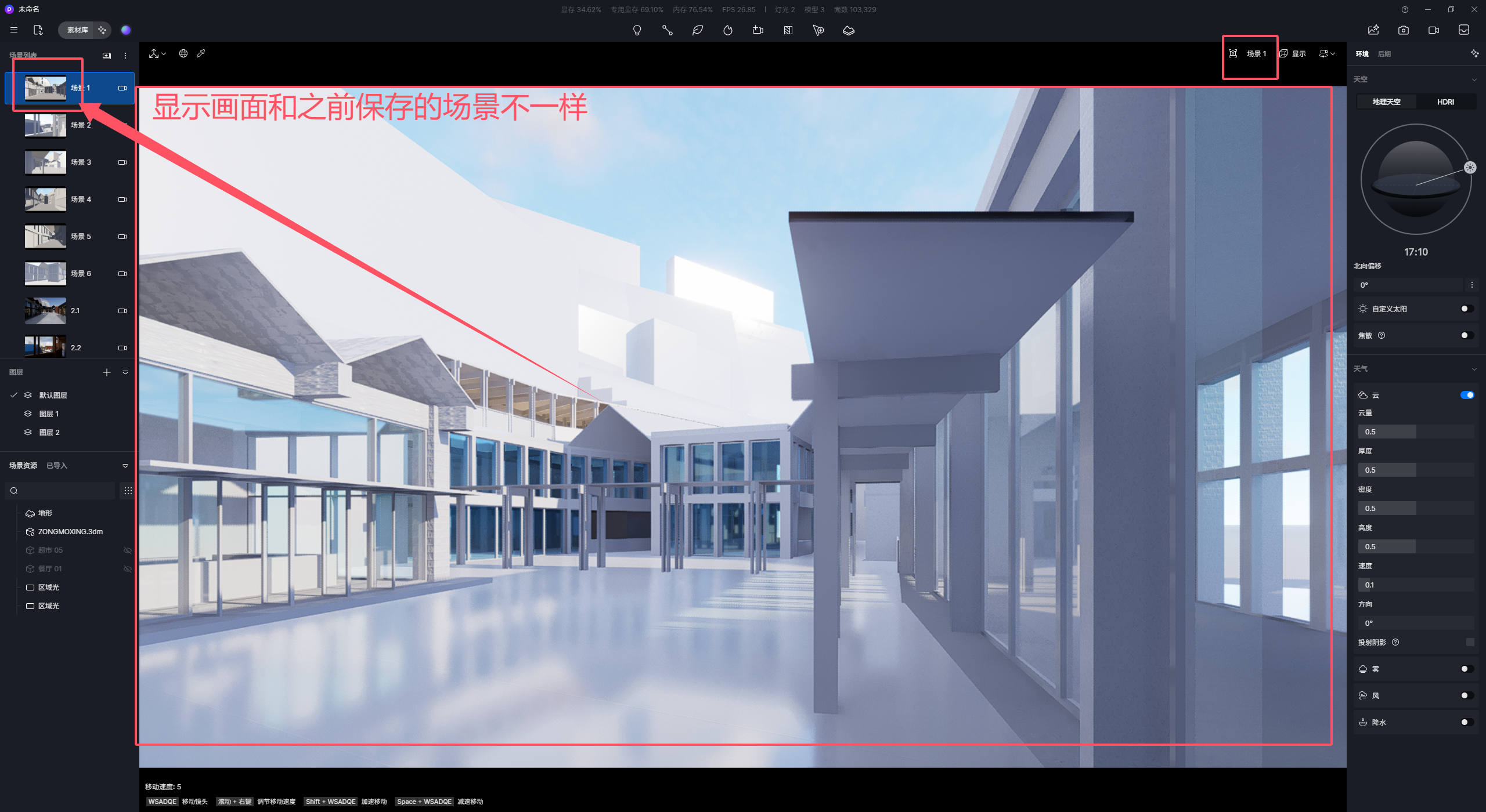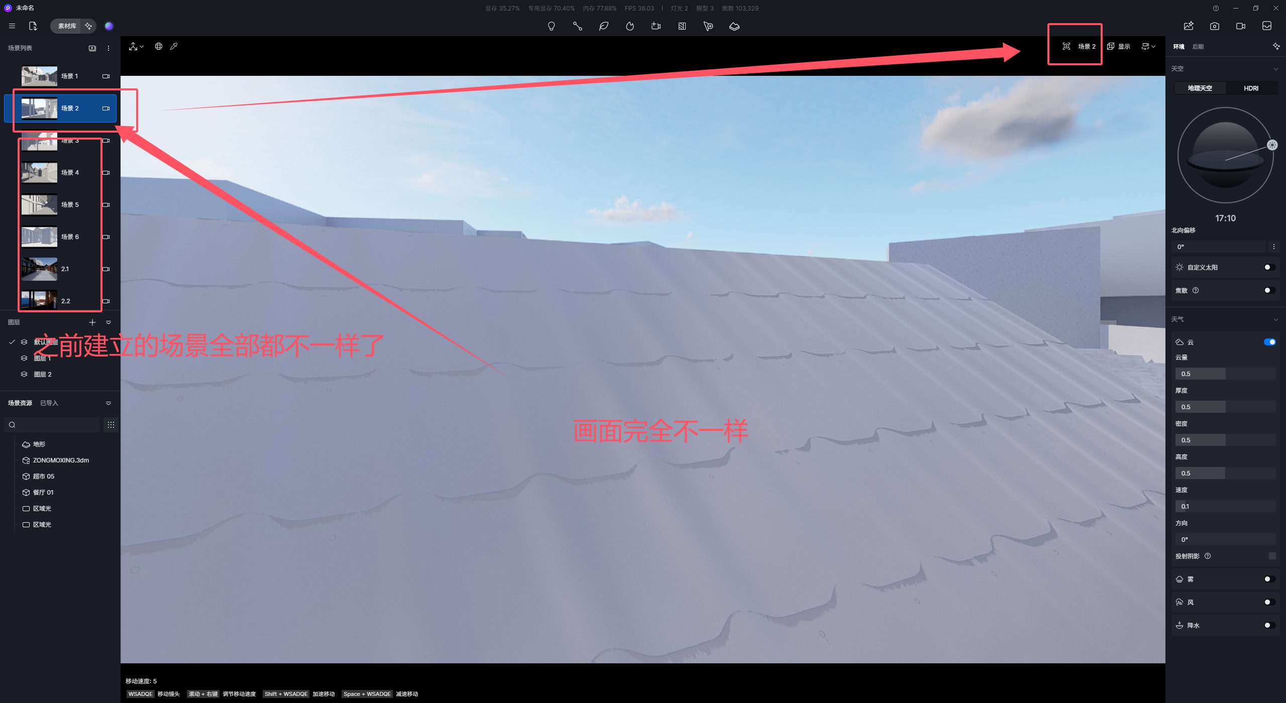 问题现象:D5创建了场景,做了贴图再点击之前的场景结果全部位移了