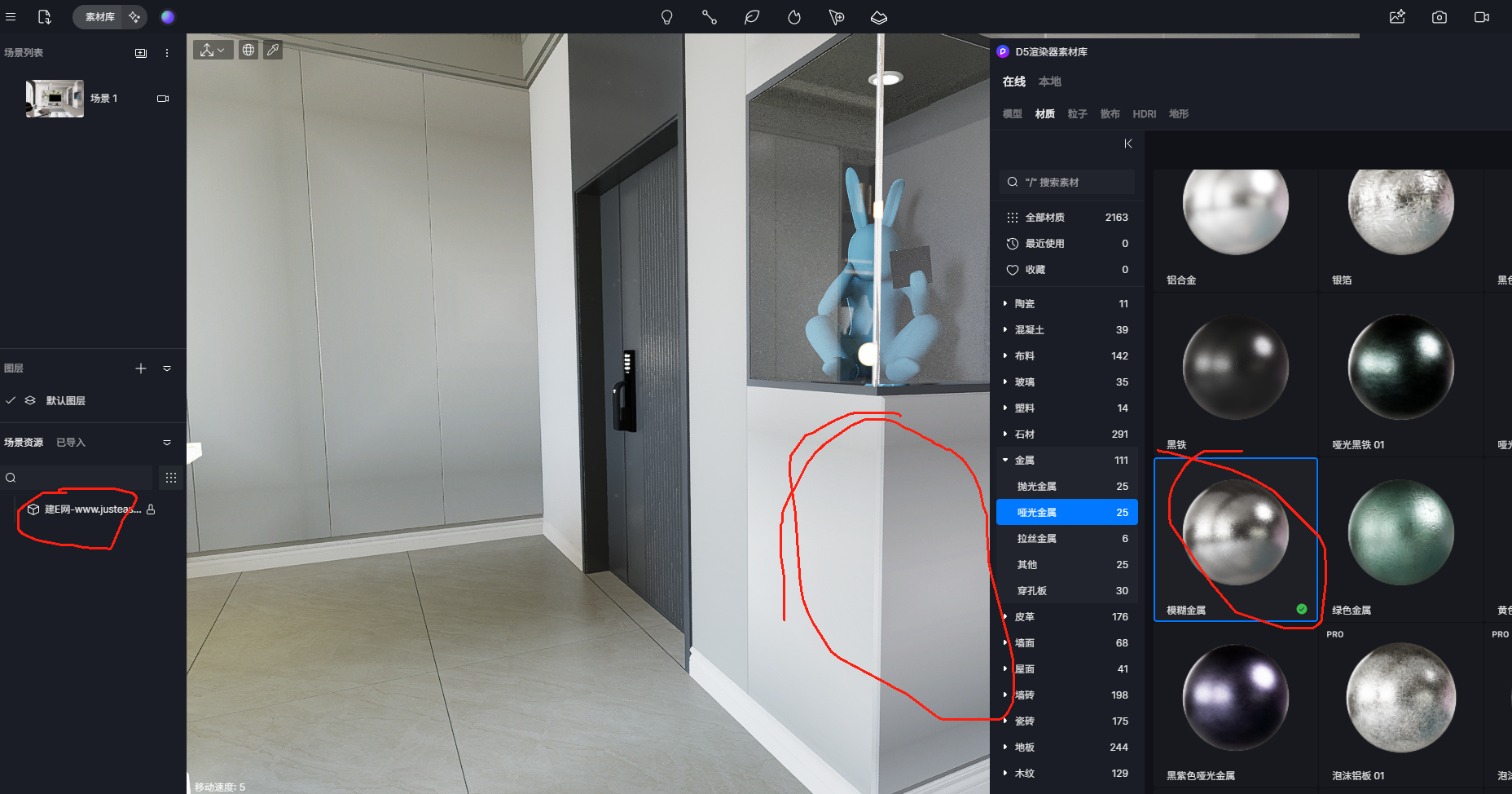 您好,D5模型导入默认为一个整体,根据材质不同区分,所以在导入模型之前需要在建模软件中进行简单的材质区分,后期才能分别进行调整。 比如调整转角处材质,需要在建模软件中给这部分单独一个材质,再更新一下模型,D5读取到这部分材质与其他材质区分后,才可以单独进行调整。