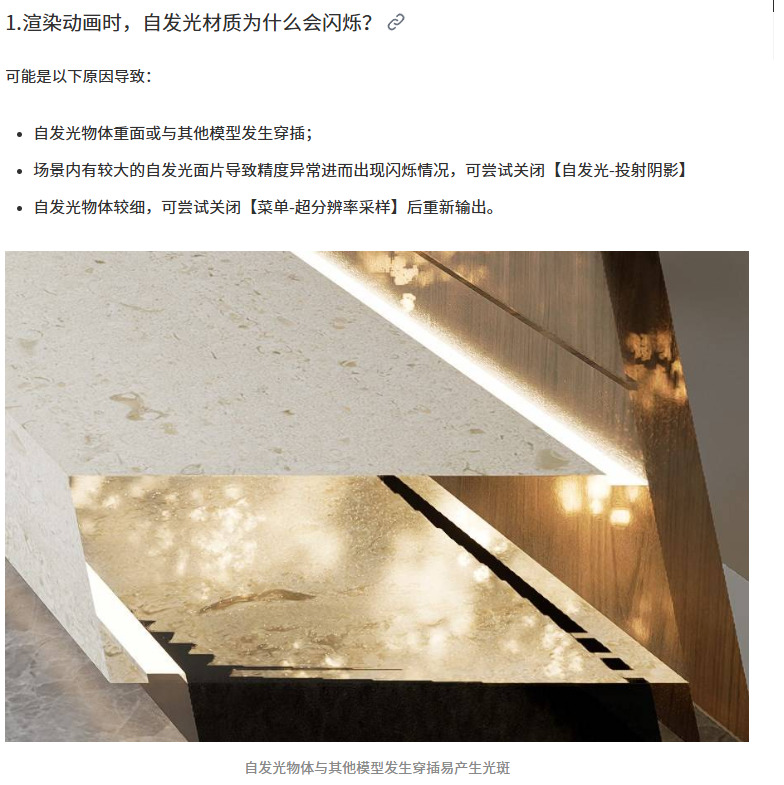 您好,渲染时有开启偏好设置中的SR图片渲染组件吗?自发光物体与其他模型发生穿插易产生光斑,您可按照以下方法排查一下: