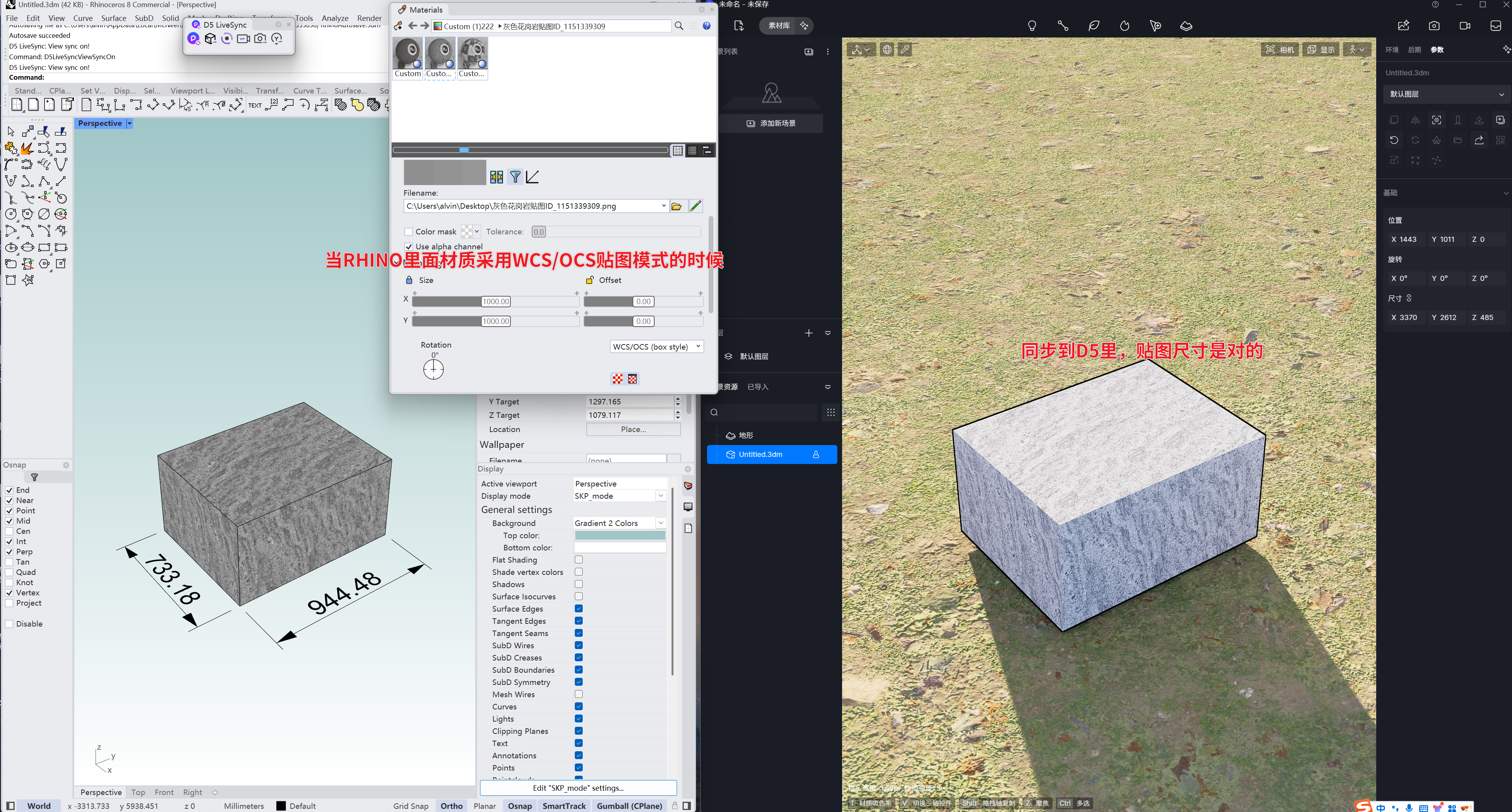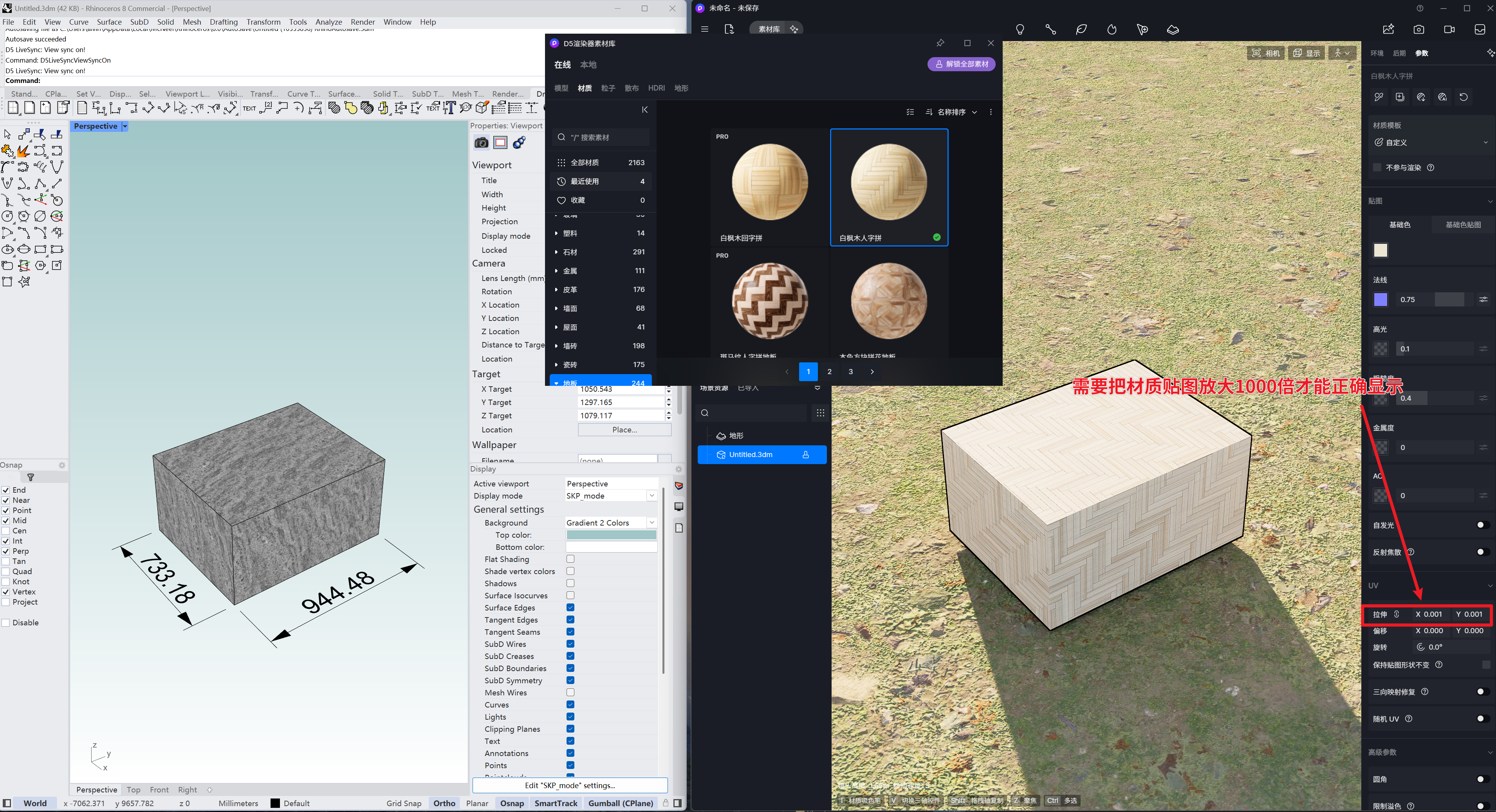 在rhino里如果材质采用WCS/OCS贴图模式,同步到RHINO里,用材质库中的其他材质替换之后,贴图尺寸需要放大1000倍才能正确显示。