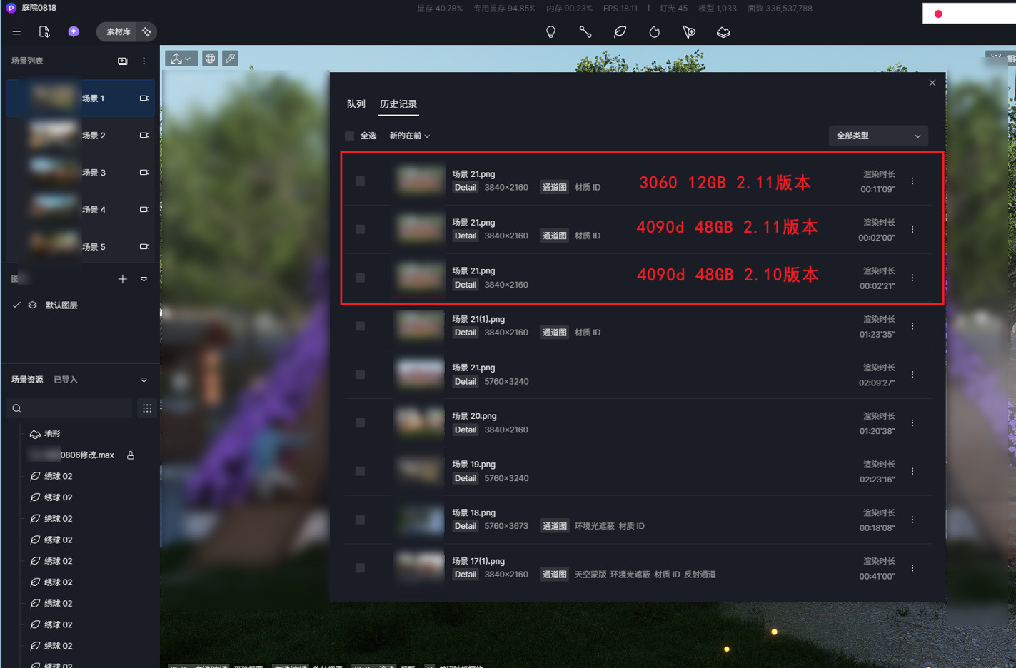 您的场景文件我们已收到并进行了测试,我们在两台设备上分别使用 2.10 与 2.11 版本进行了渲染,测试结果如下: