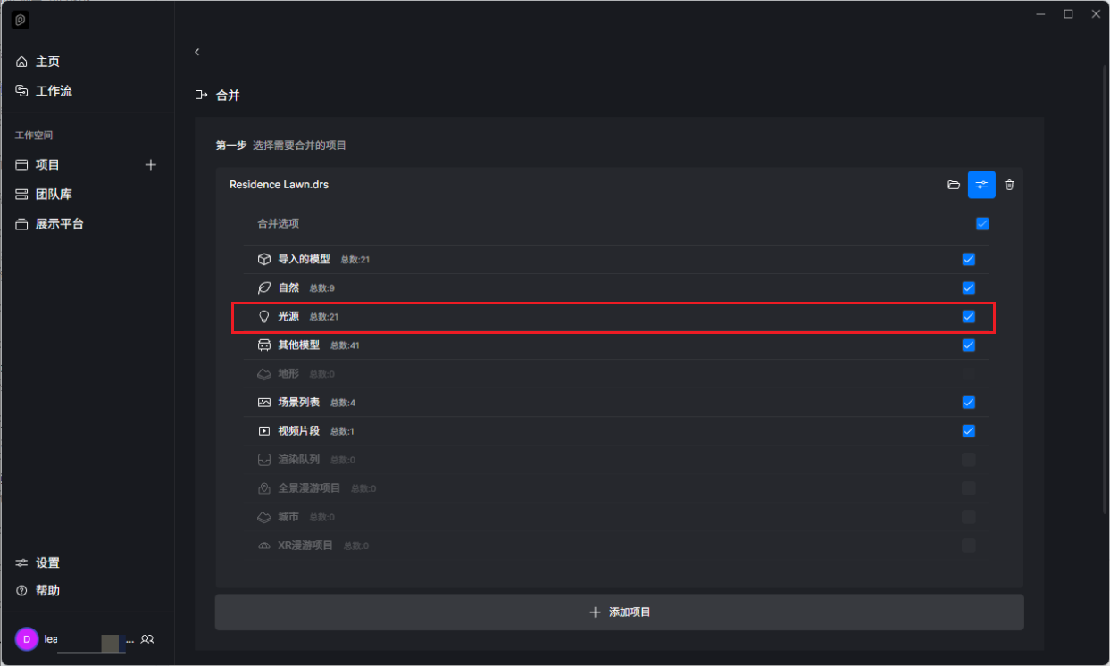 您好,可以把这个光源跟物体成组,然后添加到本地库素材然后在新的项目里从本地库素材里使用。这个会办法也可以试一下。