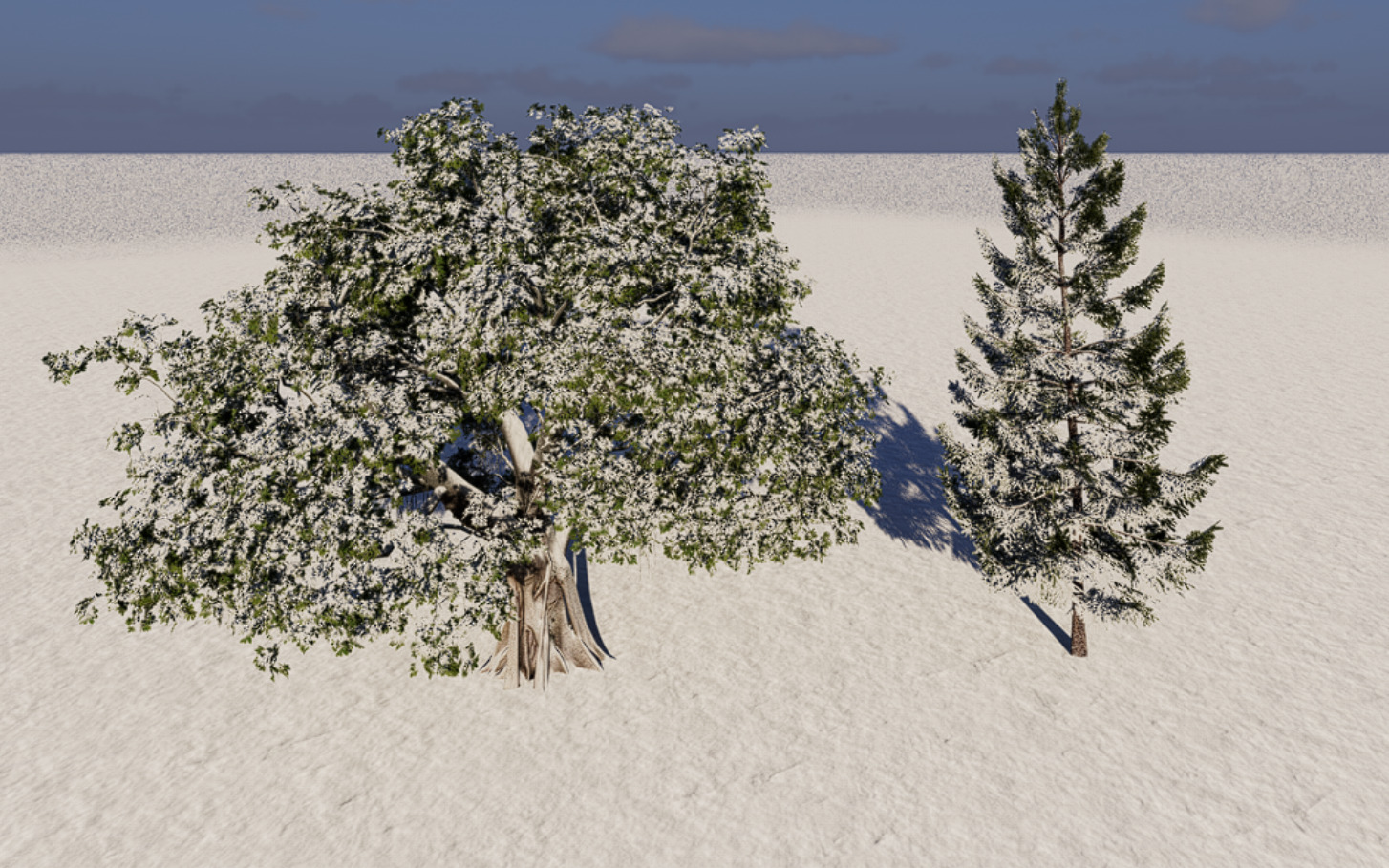您好,目前环境积雪效果作用于植物叶片的垂直投影方向。当植物叶片朝向较为复杂时,部分叶片可能以背面方向朝向视口,因此会出现积雪未完全覆盖的情况。该表现属于当前预期内效果,我们也会持续进行优化,感谢您的反馈与理解。