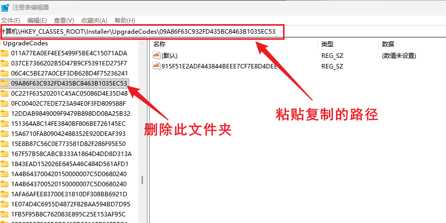 打开 注册表编辑器 在地址栏中粘贴以下路径,并删除对应的文件夹: HKCR\Installer\UpgradeCodes\09A86F63C932FD435BC8463B1035EC53 删除完成后,重新运行安装程序