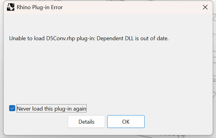 您好,我在Revit和Rhino里都安装了D5渲染器及联动插件,另外,我还在Revit里安装了Rhino的Rhino.Inside.Revit插件,所以当我在Revit里打开Rhino时,它都会弹出这个面板,就算我每次都勾选了让它"Never load this plug-in again",它每次都会弹出来。