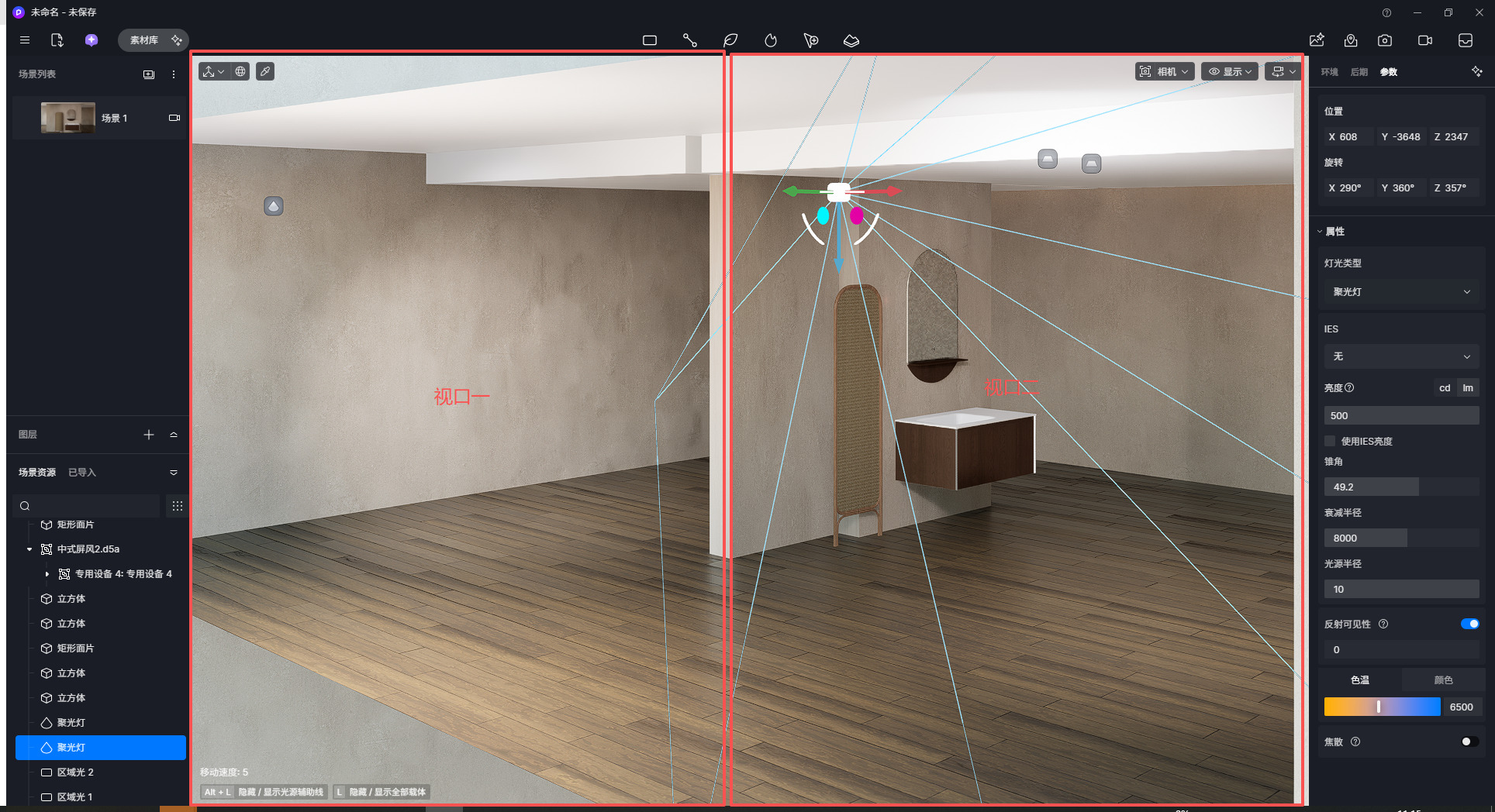 进行固定,再回到原视角进行调整,即可在不同角度查看光源效果: