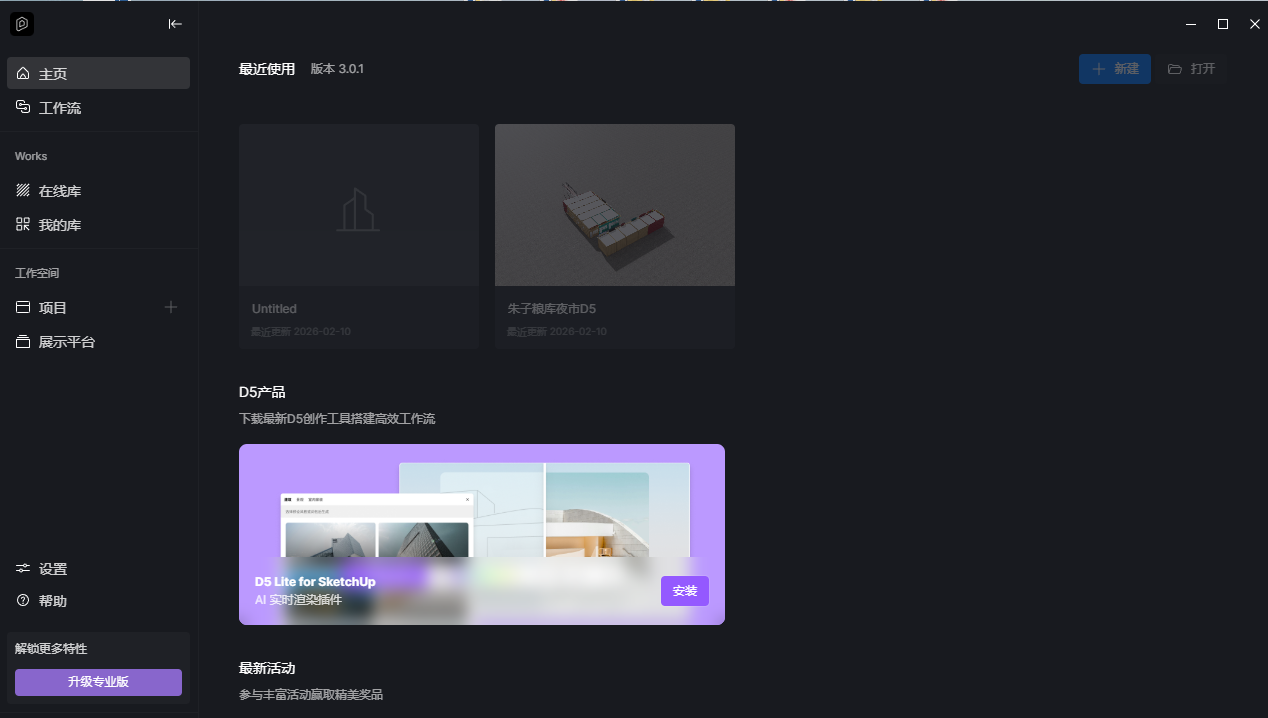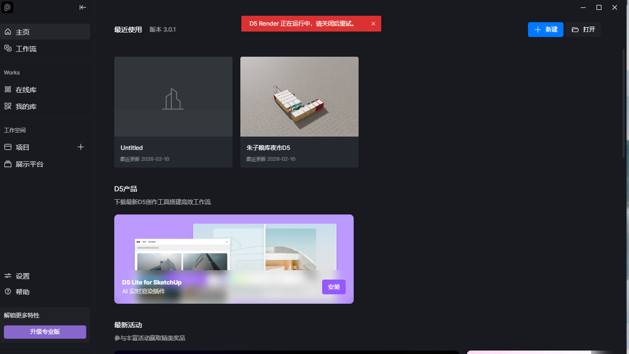 3.安装后在使用新文件时同步渲染时发现弹出的命令框异常,并且打开的渲染界面不完整,渲染场景无法自由旋转视图,所以关闭文件,该文件关闭后文件名自动保存为Untitled且无法打开。D5启动器也无法打开