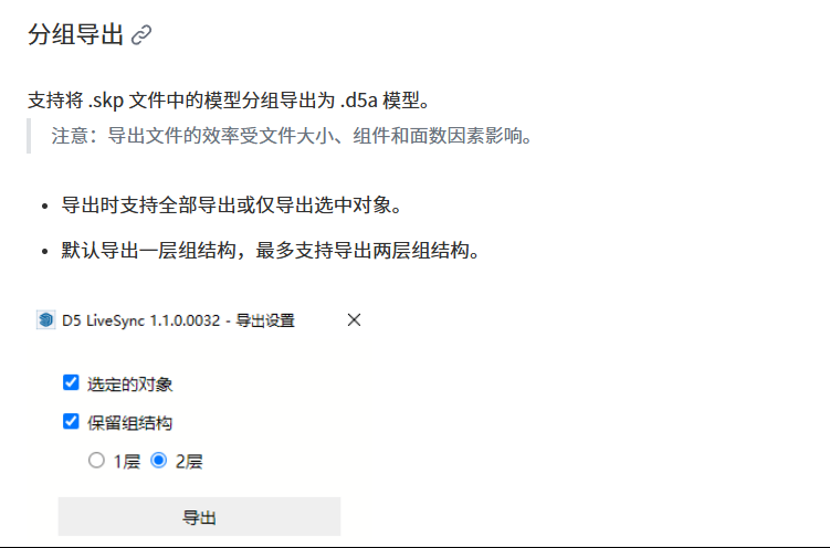 如果需要单独调整模型中的部分组件,建议使用实时同步插件的「分组导出」功能,将模型导出为带有组结构的 D5A 文件后再导入 D5。 模型的分组结构可以被保留,进入 D5 后即可对对应的模型组件进行分别调整。