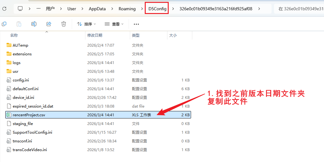 打开截图路径,复制重装前日期的对应文件夹内的 recentproject.csv 文件
