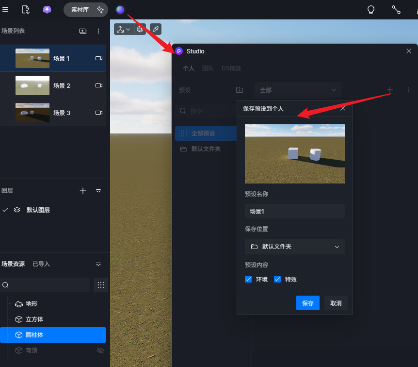 如果需要 部分场景后期不同,但需要保留模型显隐状态:可以将需要的后期参数保存为个人预设,然后在新的场景中双击预设即可快速复用。