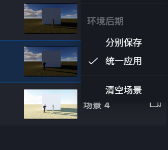 如果您需要 所有场景使用相同的后期参数:可以在场景列表右上角 → 环境后期 → 统一应用,这样所有场景都会使用当前场景的后期参数。