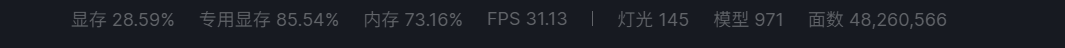您可以在 D5菜单 → 查看 →打开 显示统计信息,查看实时fps数值与GPU占用情况。如果fps数值较低,可能会导致卡顿情况。