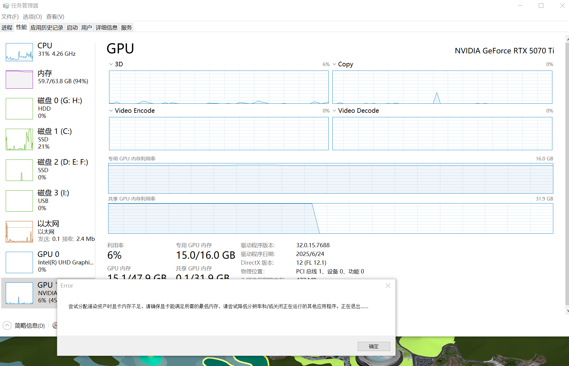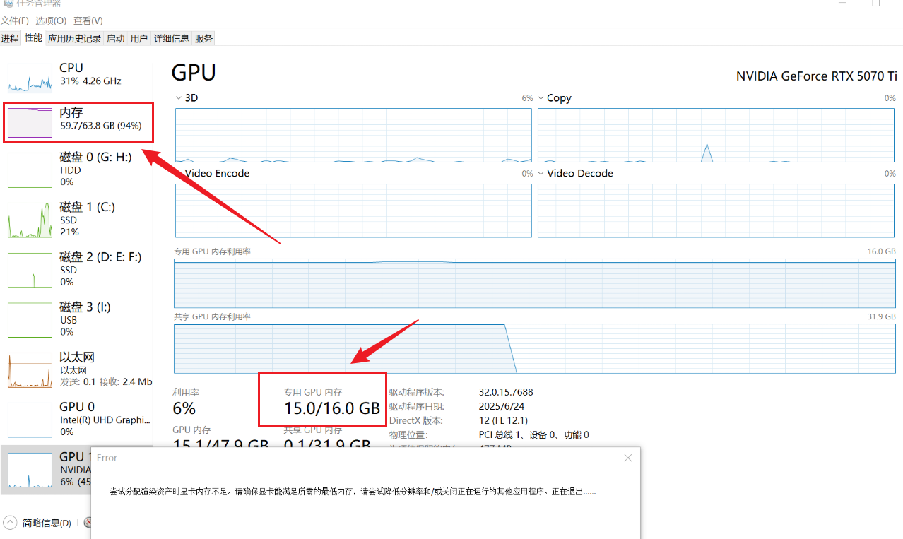 您好,从您的截图来看,当前显存和内存占用已接近上限。